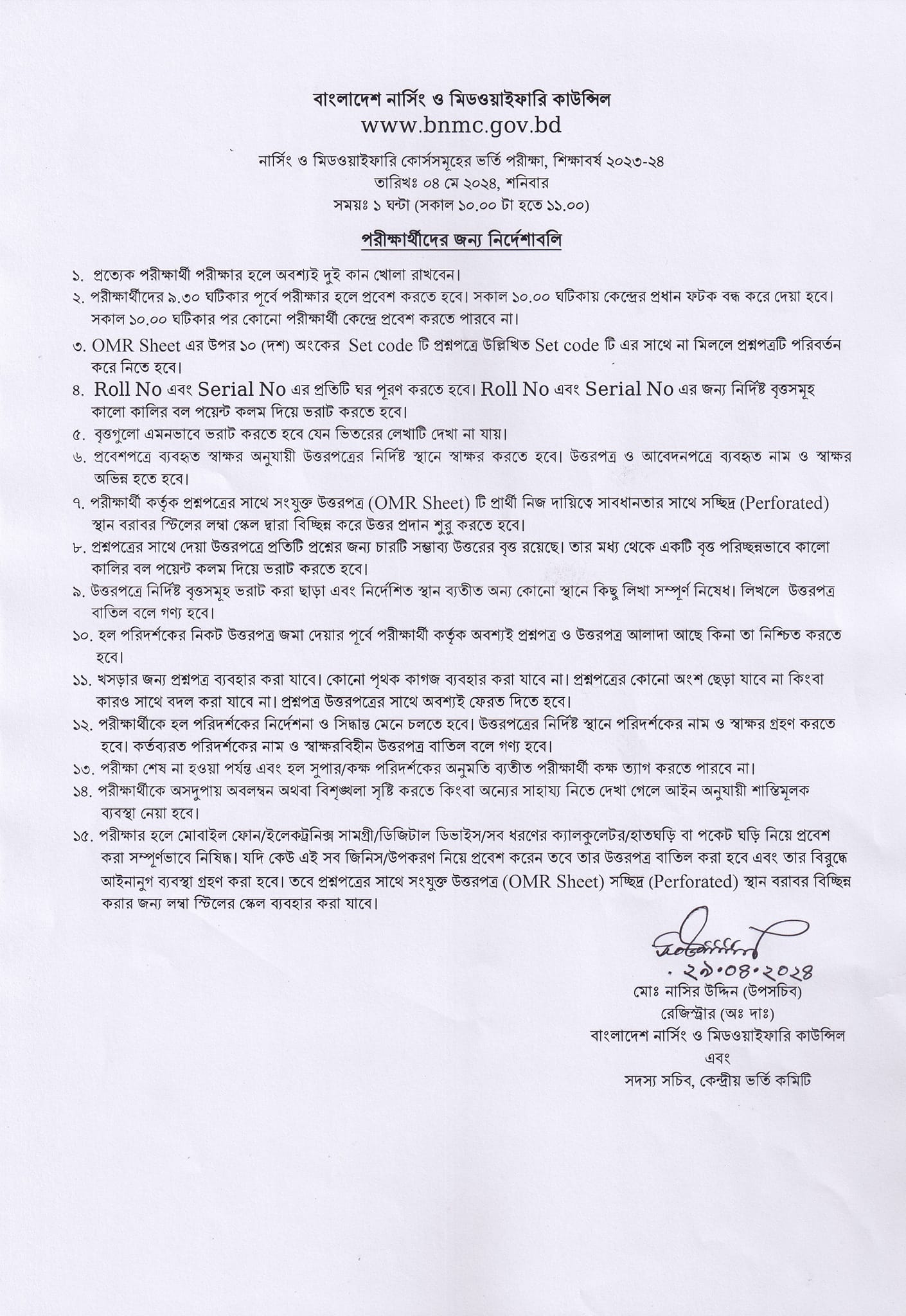 নার্সিং ভর্তি পরীক্ষার্থীদের জন্য নির্দেশনাবলি।